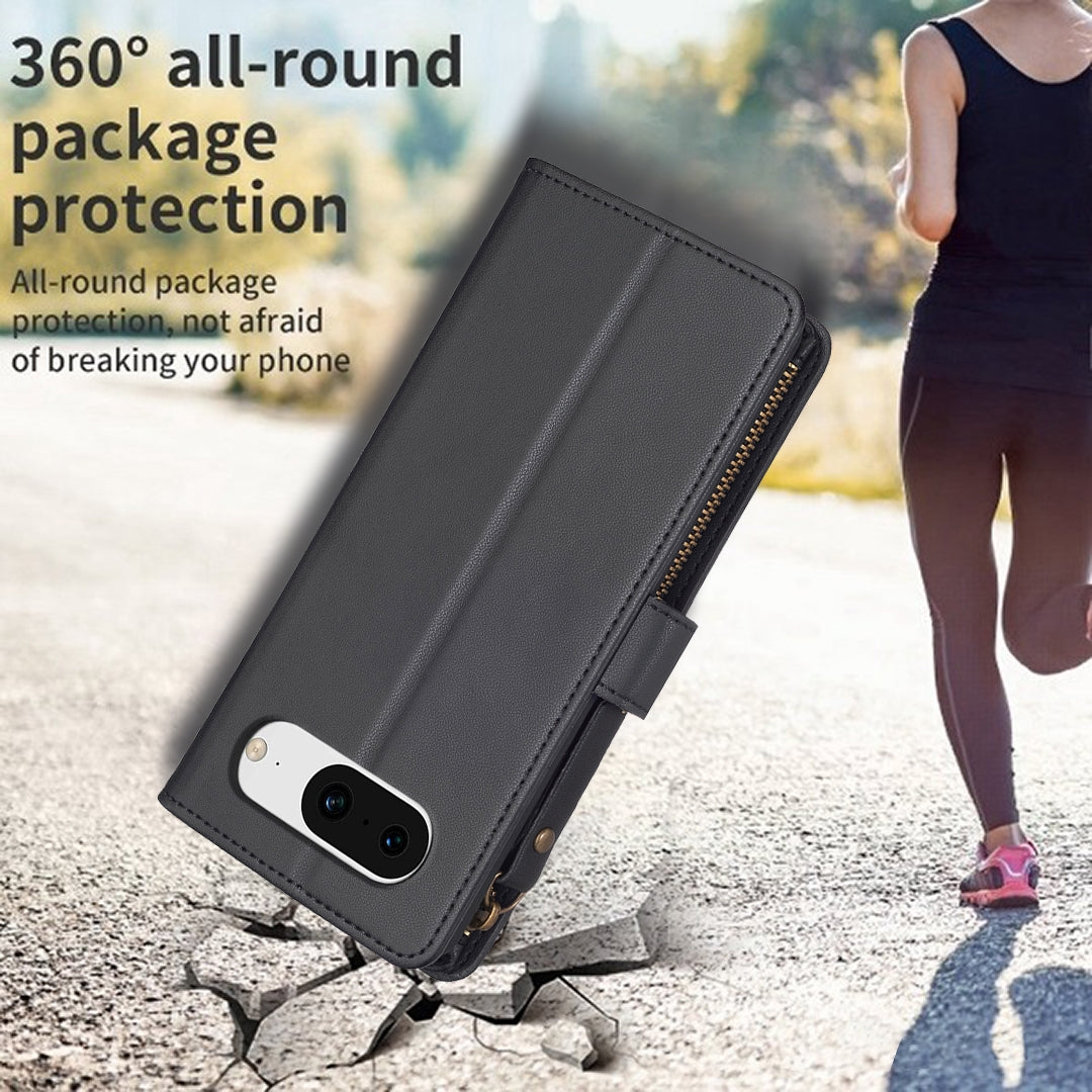 Google Pixel 8 Leather Flip Wallet Phone Case with 9 Card Slots, Zipper Compartment, and Adjustable Stand