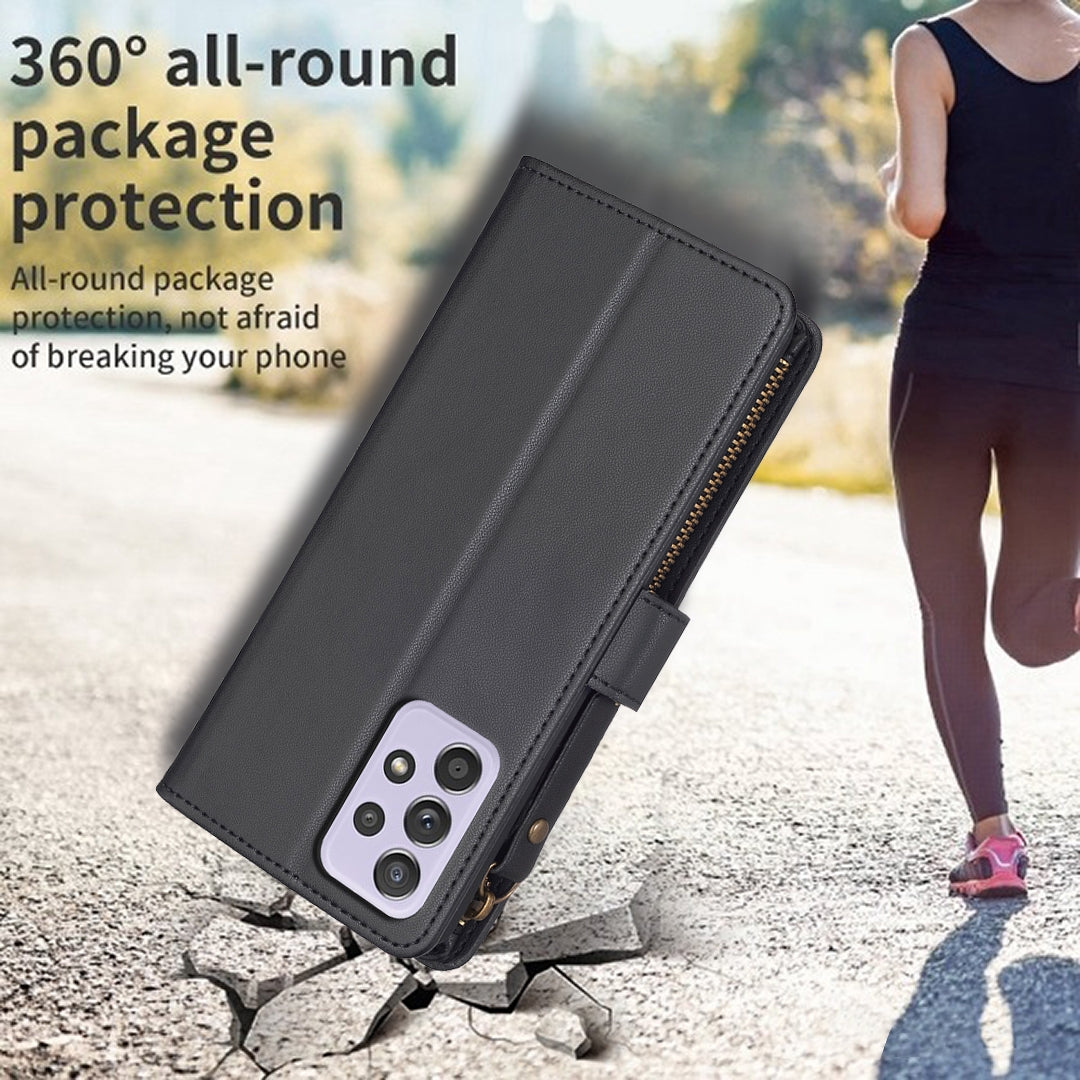 Samsung Galaxy A52 Leather Flip Wallet Phone Case with 9 Card Slots, Zipper Compartment, and Adjustable Stand