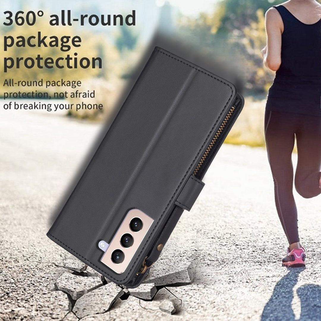 Samsung Galaxy S21+ 5G Leather Flip Wallet Phone Case with 9 Card Slots, Zipper Compartment, and Adjustable Stand