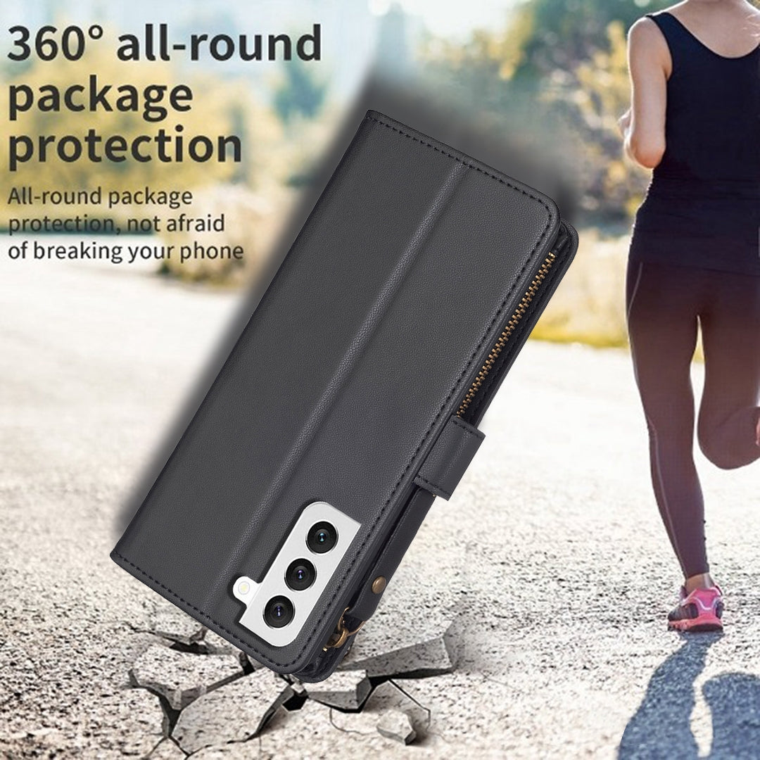 Samsung Galaxy S22 5G Leather Flip Wallet Phone Case with 9 Card Slots, Zipper Compartment, and Adjustable Stand
