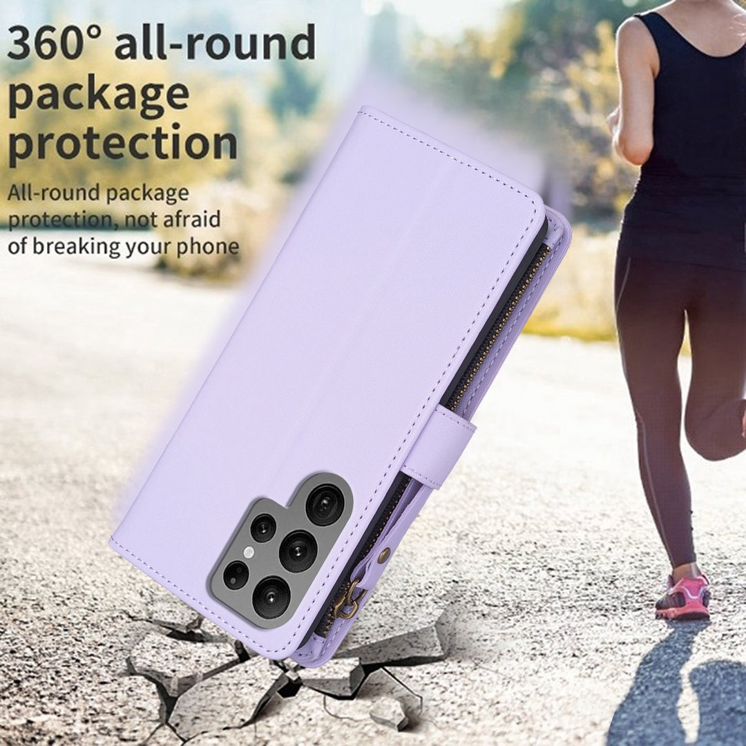 Samsung Galaxy S23 Ultra 5G Leather Flip Wallet Phone Case with 9 Card Slots, Zipper Compartment, and Adjustable Stand